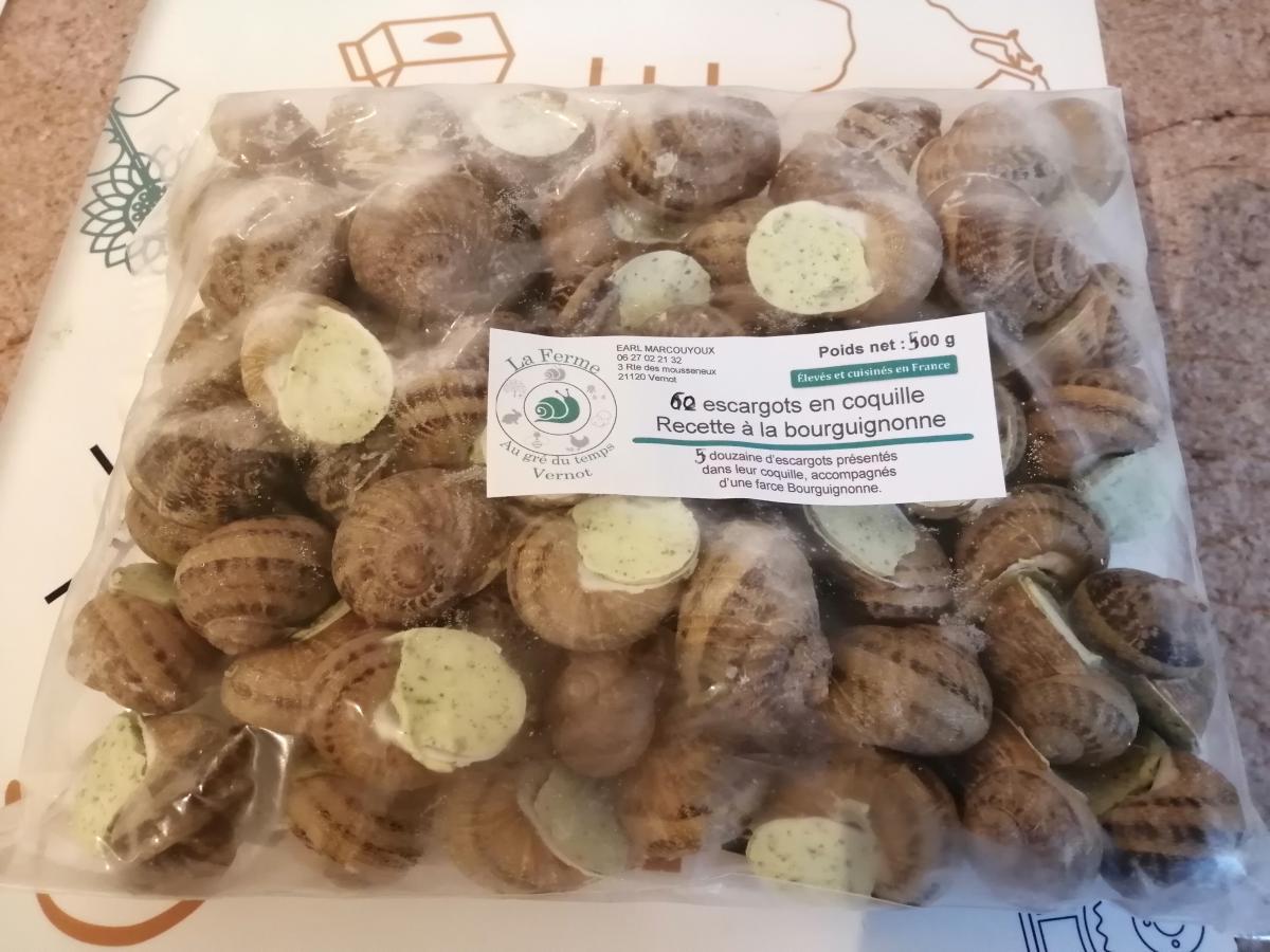 Sachet de cinq douzaines d'escargots présentés dans leur coquille, accompagnés dune farce à la bourguignonne.
