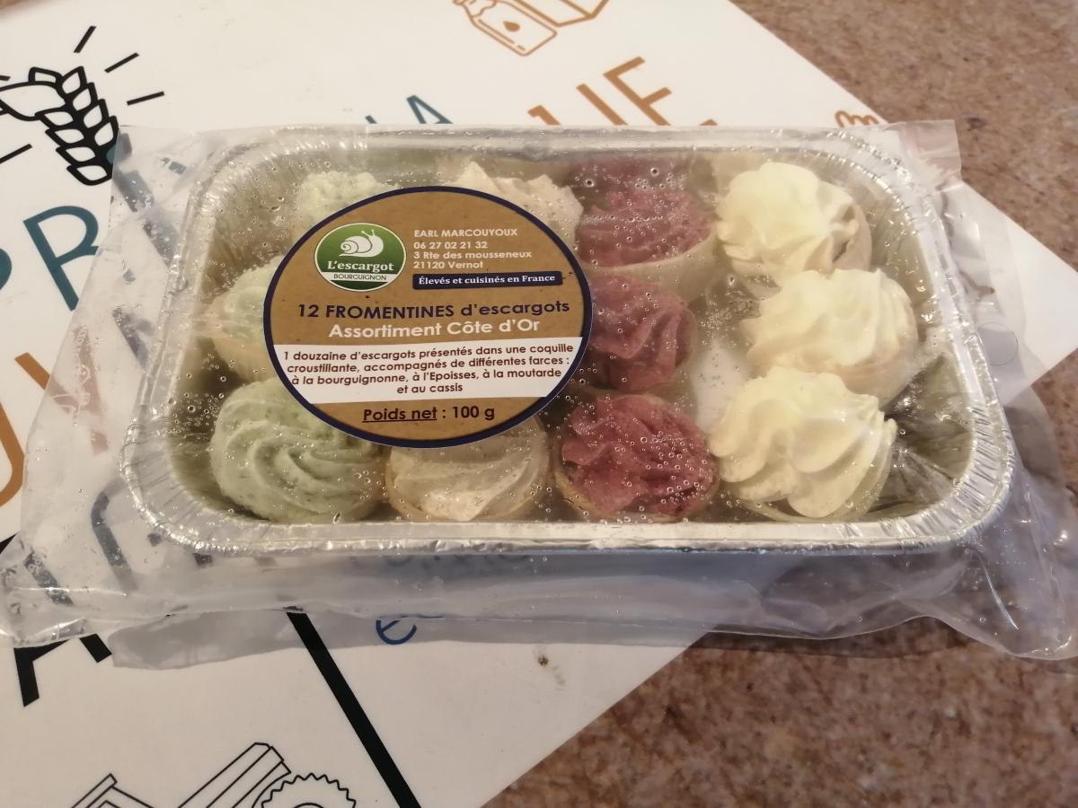 Une douzaine d'escargots présentés dans une coquille croustillante, accompagnés de différentes farces : à la bourguignonne, à l'Epoisses, à la moutarde et aux cassis. Tout se mange et il y en a pour tous les goûts !