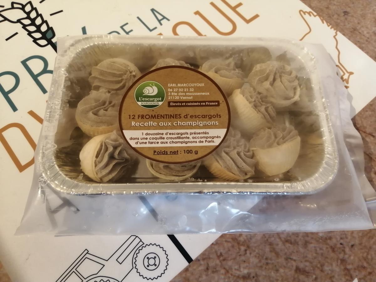 Une douzaine d'escargots présentés dans une coquille croustillante, accompagnés dune farce aux champignons. Tout se mange !