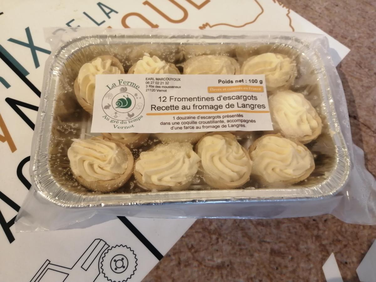 Une douzaine d'escargots présentés dans une coquille croustillante, accompagnés dune farce au fromage de Langres. Tout se mange !