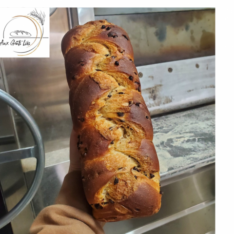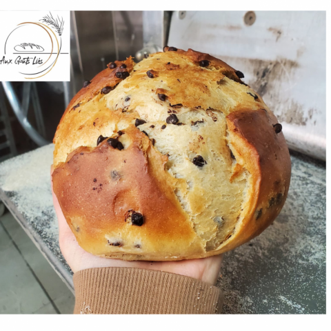 Brioche pur beurre, aux oeufs entier plein air locaux et pépites de chocolat noir, fabriquée à partir de notre farine fermière bio.