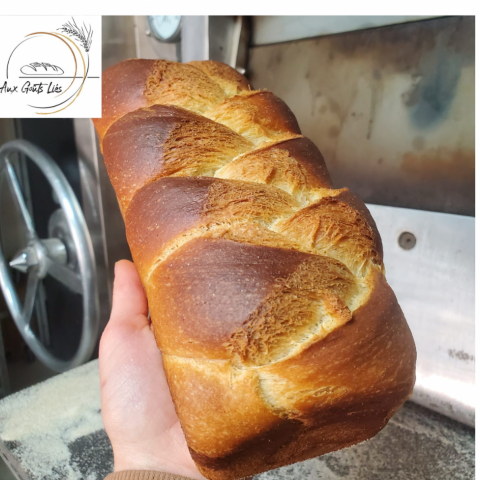 Brioche pur beurre, aux oeufs entiers plein air locaux, fabriquée à partir de notre farine fermière bio.