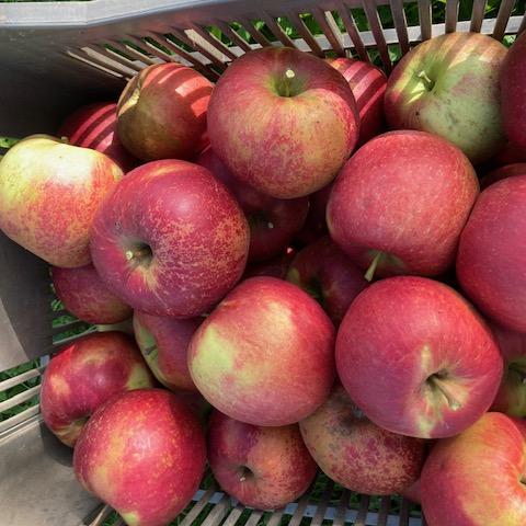 Pomme rouge parfois légèrement marbrée, c'est une pomme polyvalente à consommer en frais ou à cuire.