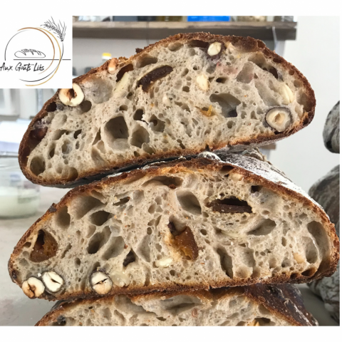 /!\ Rupture d’approvisionnement en noisettes et abricots secs bio : temporairement le pain sera aux amandes torréfiées, cranberries et jus de pomme.