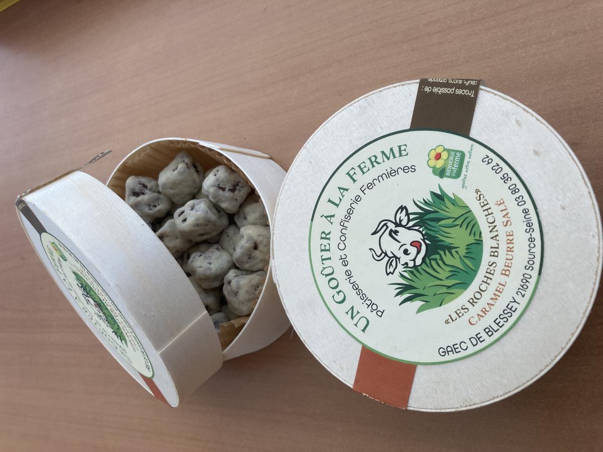 Les roches blanches présentées dans leurs boîtes en bois sont un trompe l’œil ressemblant à de petites pierres mais elles sont en fait de délicieux caramel tendre à la fleur de sel enrobée d’une fine couche de chocolat au lait et blanc. La boîte en bois rappelle celle de certain fromage car le crème des vache du GAEC de Blessey est mise en valeur dans la composition de ses caramel.