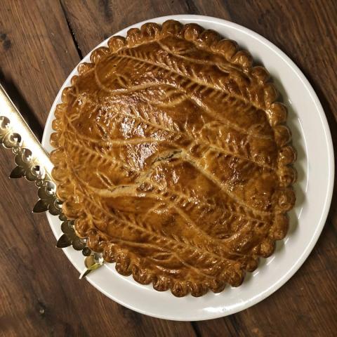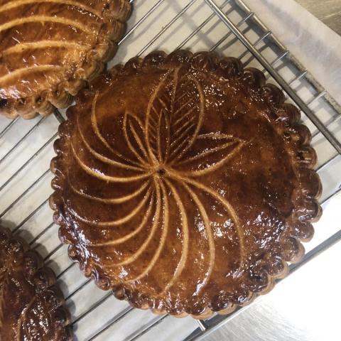 Galette des rois à la frangipane, riche en crème d'amande. Nous torréfions nous-mêmes les amandes que nous broyons et passons à la meule de pierre pour faire notre poudre d'amande. La pâte feuilletée est un feuilletage pur beurre que nous faisons à notre atelier. Les fèves aussi sont réalisées par nos soins avec l'aide de l'artiste-plasticienne Julia Morlot et Corine FLouriot, potière.