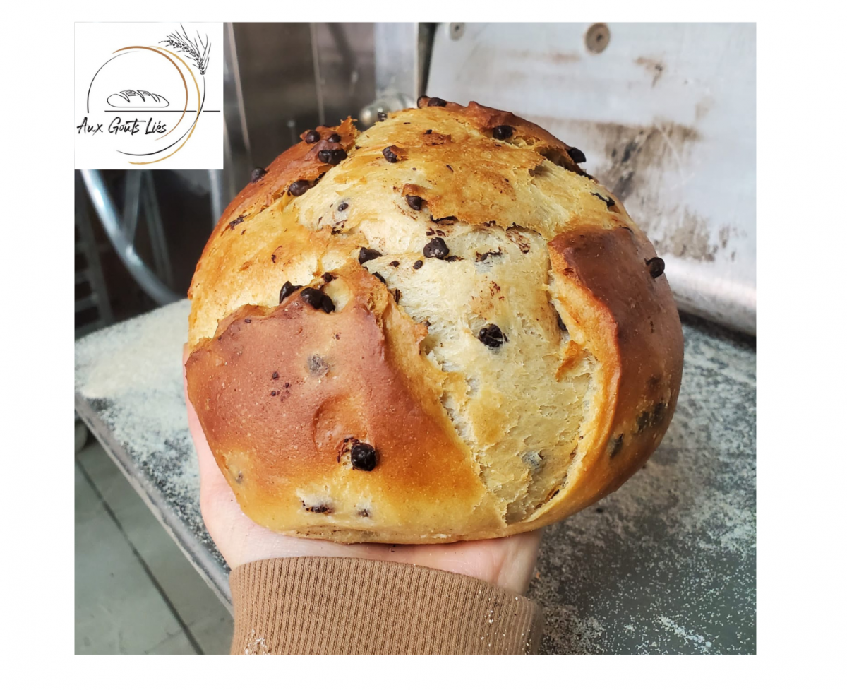 Brioche pur beurre, aux oeufs entier plein air locaux et pépites de chocolat noir, fabriquée à partir de notre farine fermière bio.