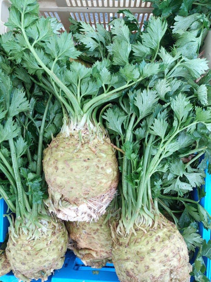 Petits céléris raves fraîchement récoltés vendus avec les feuilles, pesant environ 400 g.
