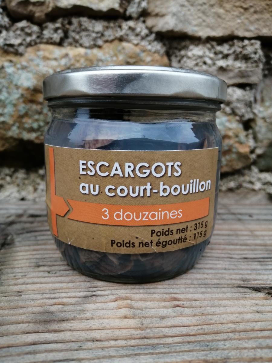 Chairs d'escargot (Hélix Aspersa Maxima), eau, vin (contient des sulfites), carotte, poireau, fenouil, oignon, sel, épices.