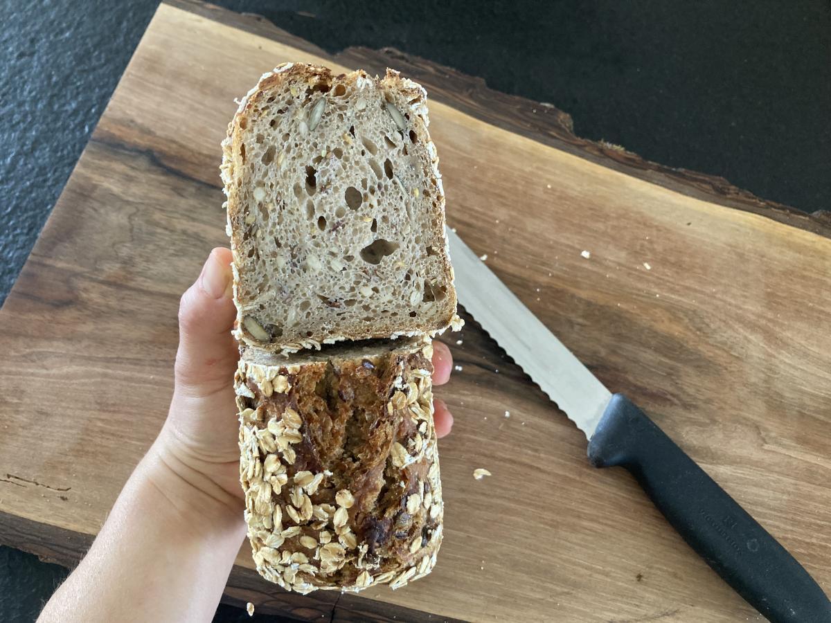 Petit pain fermenté au levain, enrichi en graines et flocons d'avoine. Il est moelleux et riche en arômes, idéal pour le petit déjeuner par ses apports nutritionnels.