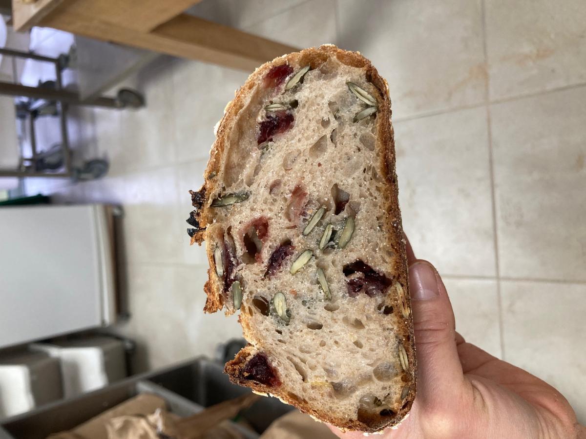 La pâte est enrichie en flocons d'avoine, cranberries et graines de courge.