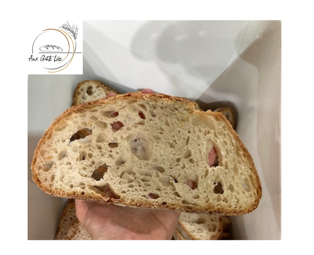 Pain au levain fabriqué à partir de notre farine fermière bio type 80 moulue sur meule de pierre.