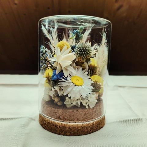 Bocal en verre 8x10cm et socle liège composée de fleurs séchées produites par nos soins.