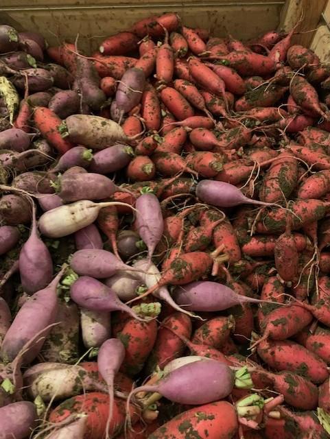 Radis d'hiver biologiques, cultivés en plein champ, non lavés, non calibrés. Saison courte.